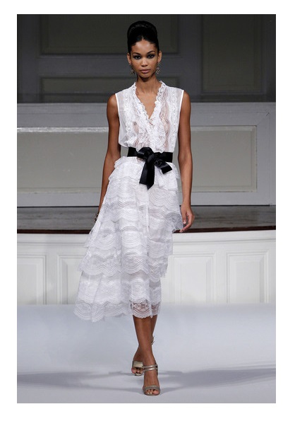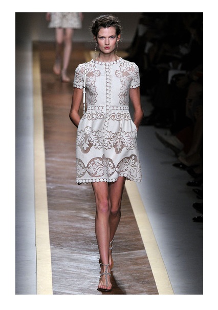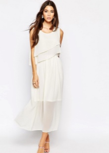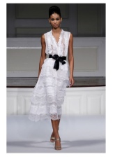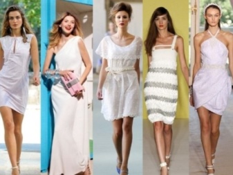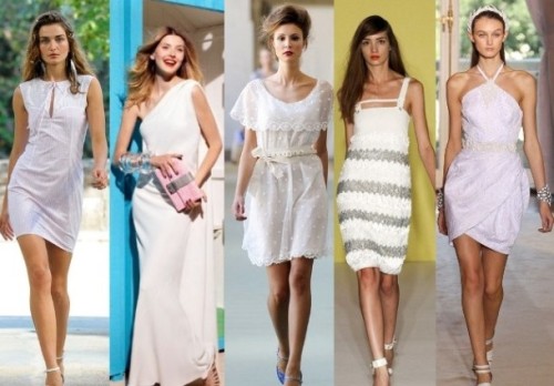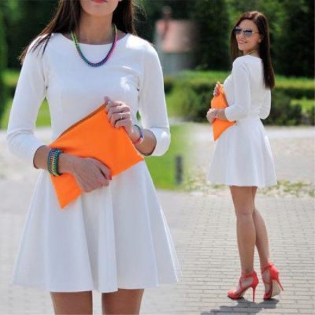 - A charming white dress with a full skirt and long sleeves and coral-colored sandals will look sexy and attractive. Such a set will look romantic and coquettish. It can be supplemented with a bright clutch envelope, sunglasses and miniature beads.