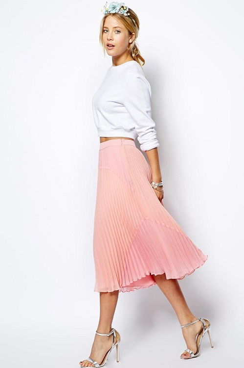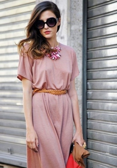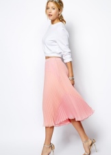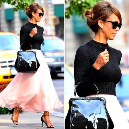 - Incredibly elegant and gentle look will be a tandem of a classic black blouse with long sleeves and a full skirt to the floor, painted in pale pink color. Such a light and original set can be complemented with a classic black lacquer bag, sunglasses, and uncluttered open sandals on a thin heel.