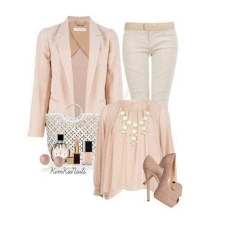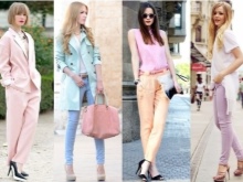 - For the office or simple walks, you can pick up a stunning outfit in bright colors. To do this, you must wear beige trousers or jeans, a pastel blouse, a classic peach-colored jacket with an English collar, and elegant patent leather shoes with heels and platform. It is possible to supplement this kit with the help of a light bright bag (with a perforation) and miniature studs / studs.
