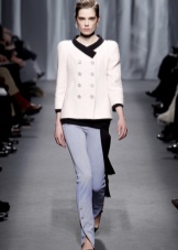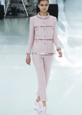 Pants made from materials such as silk or satin can be another option for confident women. They will look especially stylish, made in such trendy shades as dark blue or cool green. The most faithful addition in the style of Coco Chanel in this case will be a cropped vest with long sleeves. A beige bag in combination with shoes of the same shade will elegantly finish the image.
