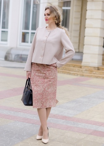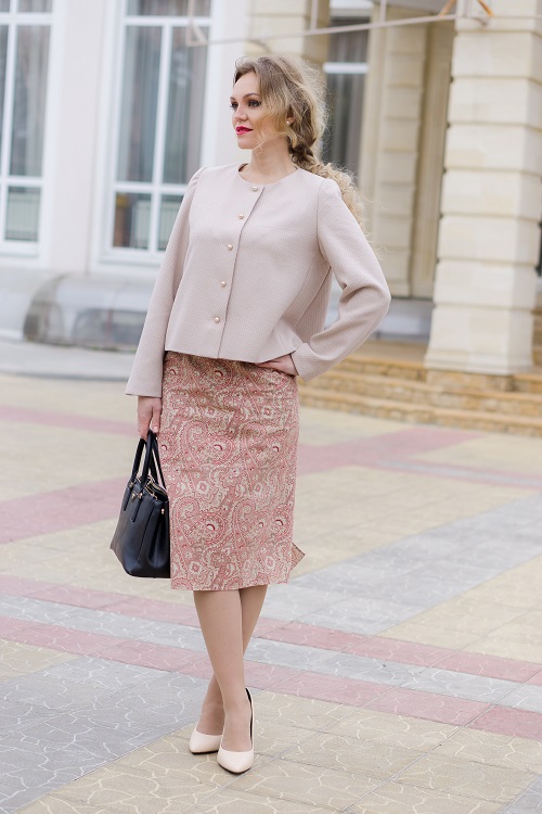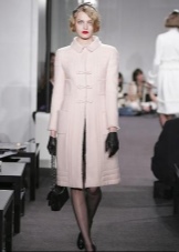 To create a romantic image, you need to choose a dress with a straight cut and the color of his cozy jacket from dense material. For example, it is possible to combine a trendy pink dress of midi length, complementing it with a cashmere jacket with buttons without a collar. Such a tandem will emphasize the charm and sophisticated taste of its owner. The bow can be supplemented with a small neutral-color handbag and nude stiletto heels with a pointed toe.