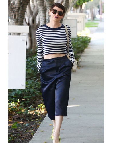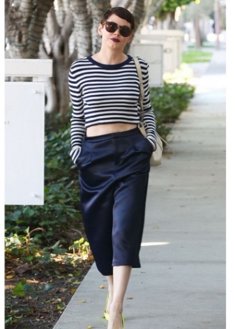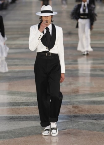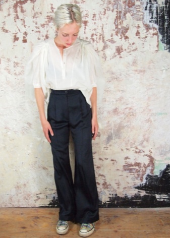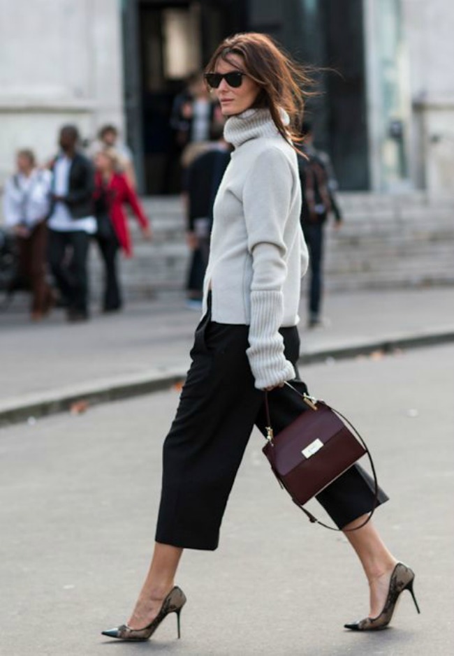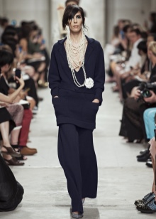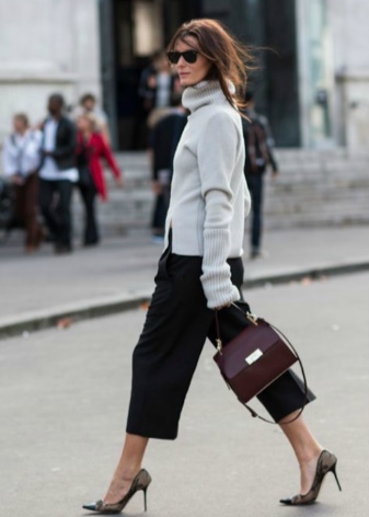 Naturally, the wardrobe in the style of Coco Chanel is unlikely to do without stylish models of culottes of an average fit. They are able to transform any girl, making her the object of attention.A very effective image can be obtained with the help of classic wide black pants with a length above the ankle. In this case, the highlight will be the presence of a bulky wool sweater in combination with high heels.