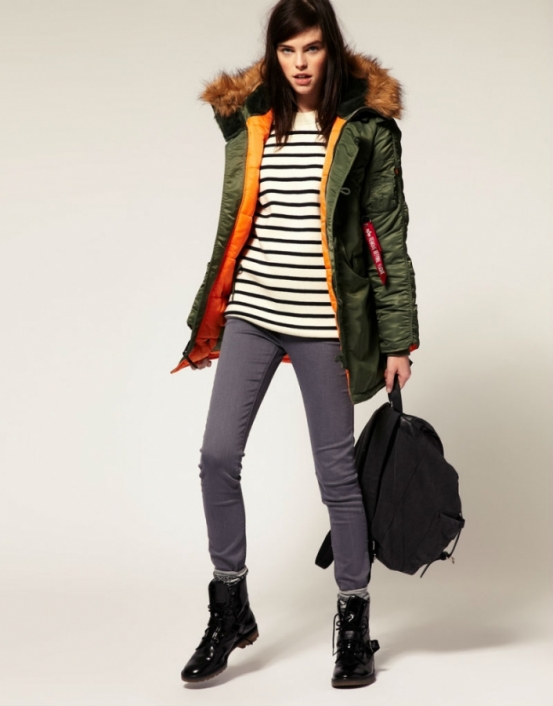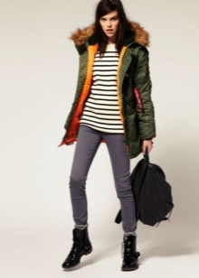 - As an outerwear, this style provides many options. It will look good short down jackets, parks, windproof anoraks with a buckle to the middle. The presence of pockets on the buttons or zipper, hoods, pockets, kangaroos, ribbons on the hood and the lower part - all this is typical for sportswear outerwear. Some sheepskin coats or sheepskin coats, only made of faux fur, belong to the sport category.