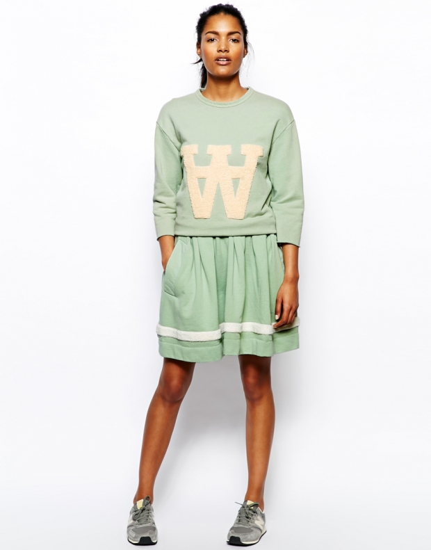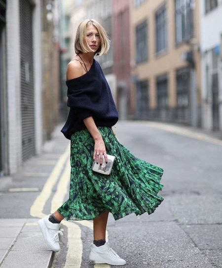 - For a youth party and even dates, a blue skirt with pleats and a high waist mini length combined with a bright pink oversize sweater will suit the best. Accessories will add a flamboyance to the image: a baseball cap and high heels in tune to the top and a clutch in the colors of the bottom.