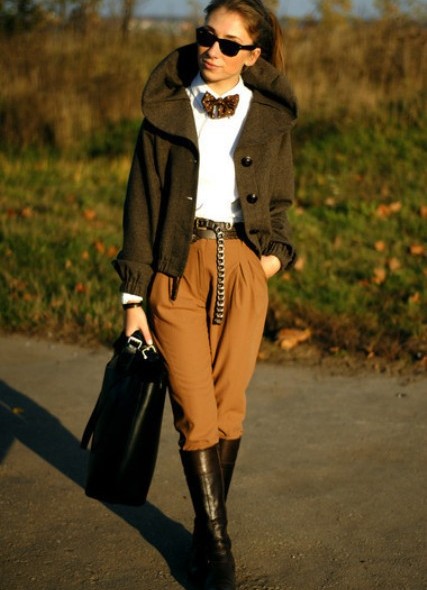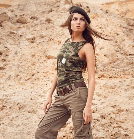 It assumes a certain color range, which includes khaki, brown, beige and dark shade of green. In the spirit of military themes in the image can be shirts with collars and shoulder straps, trousers, breeches and high lace-up boots. However, the cut of clothes should remain free, as befits a sports style direction.