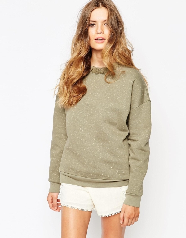 - In cool weather, you can wear sweatshirts of various styles, a bomber jacket or a windbreaker, a shirt, a sweatshirt or a turtleneck, a hoodie or a jumper. Zipper is most often used as a fastener, pockets are allowed. The neck can have the most different style: a collar or a gate golf, a hood, an inlay.