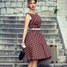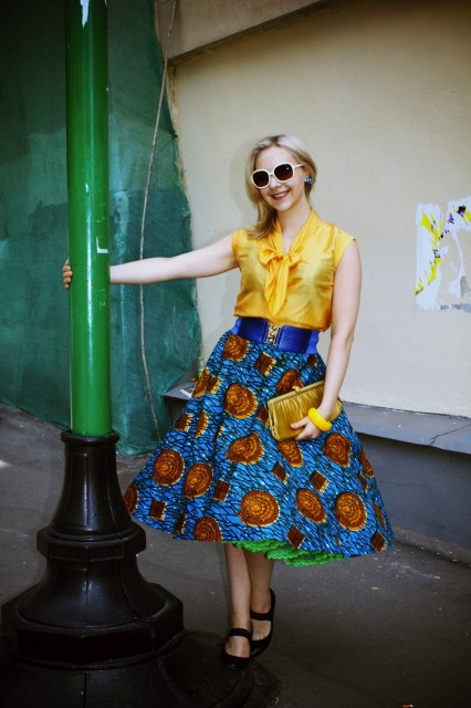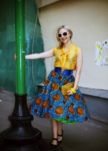 The ensemble skirt + blouse will perfectly fit into any situation. To create it you will need a monochromatic silk blouse with spaghetti straps and a fluffy skirt with a contrast print. The image will be finished with a lacquered belt and the corresponding ribbon in hair. You can also wear large beads and a bright bracelet.