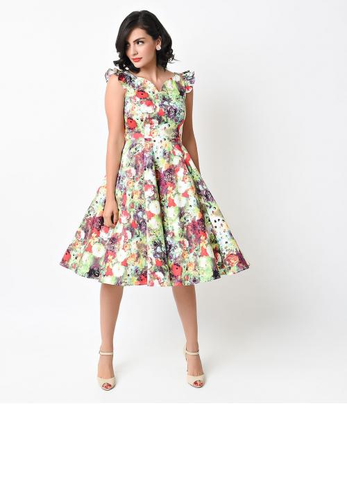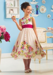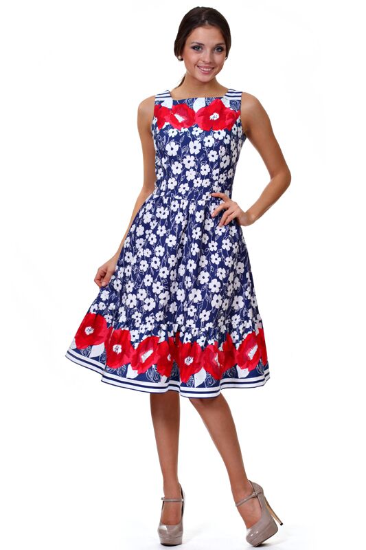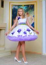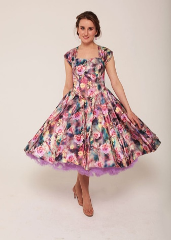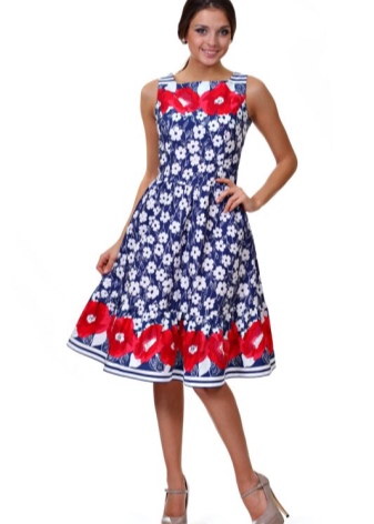 Clothes with large red flowers or delicate blue forget-me-nots, bright yellow asters or sunflowers giving a sunny mood will look stylish and impressive. Such models are easy to complement with a green handbag and a satin ribbon with an artificial flower in a hairstyle. It is important that the flower on the ribbon in harmony with the colors on the dress.