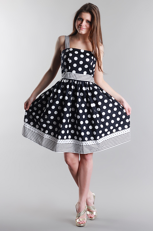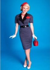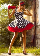 An excellent bow will help create a white dress with a print in the form of large black peas in combination with long gloves of black or red color.