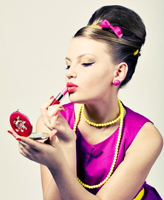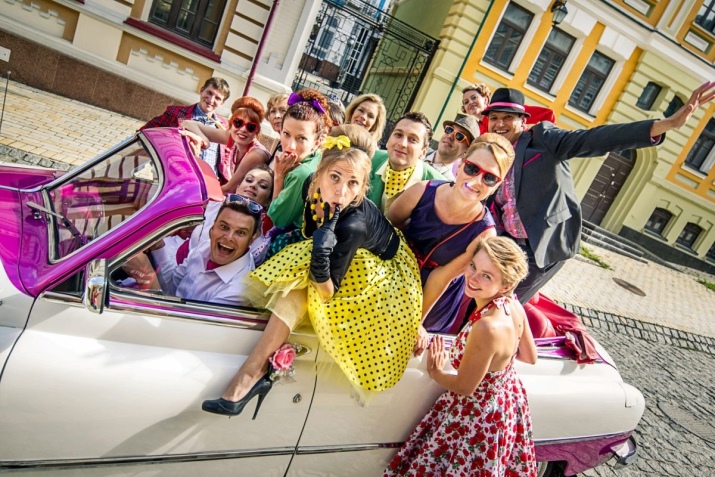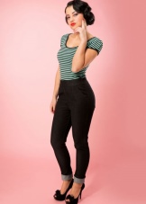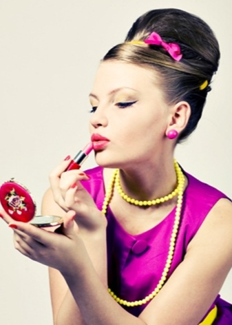 As for makeup, bright lipstick and wide arrows with black eyeliner around the eyes are classics of the genre. The use of bright shadows, such as carrot, yellow or blue.