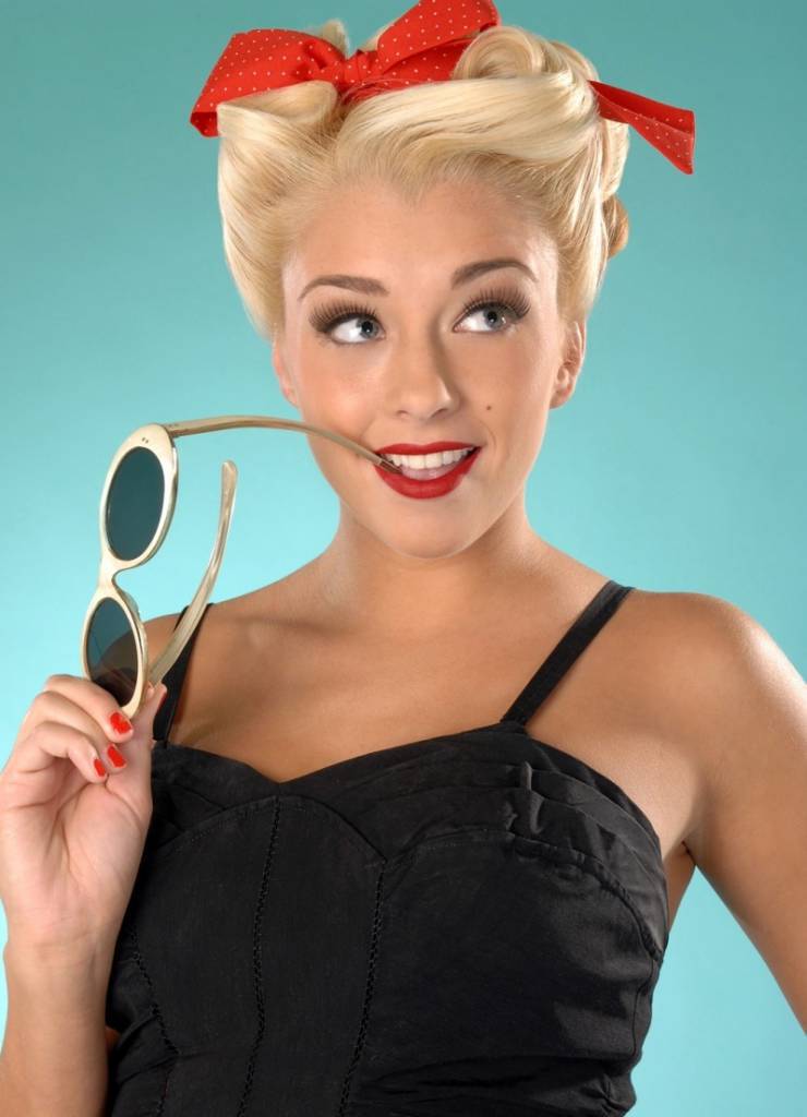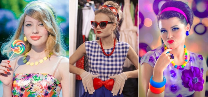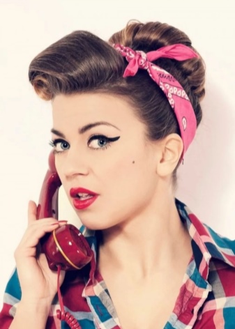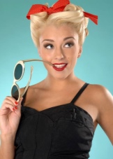 Hairstyles and cosmetics occupy an important place in the stylish direction. Characteristic hairstyles are high bouffant, babett, loose curls, generously "flavored" varnish. You can decorate hair with bandages, ribbons, headbands, hairpins and other interesting and bright elements.