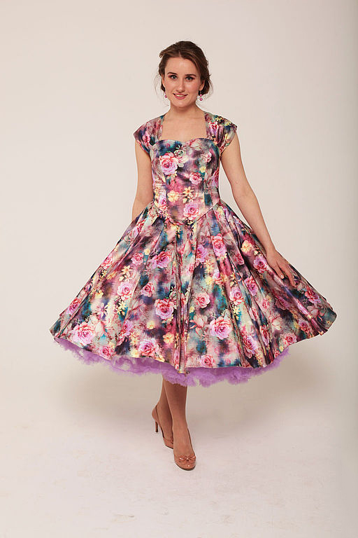 The main attribute of the wardrobe for women was a fitted flared bottom dress. To give his skirt more volume, we wore several tulle petticoats under her. At the same time, the garment top could be decorated with a deep open neckline or wide straps. The sleeve could be of any length or absent altogether. Sleeves-lanterns were very popular. Often outfit draped on the bodice.