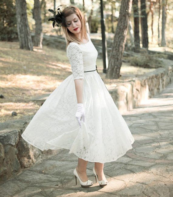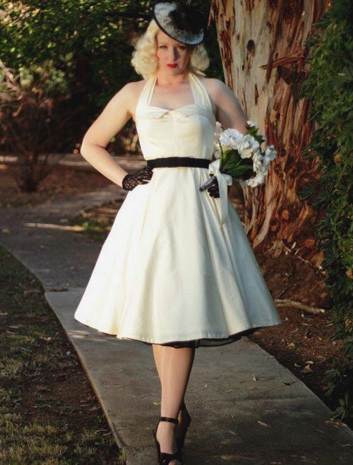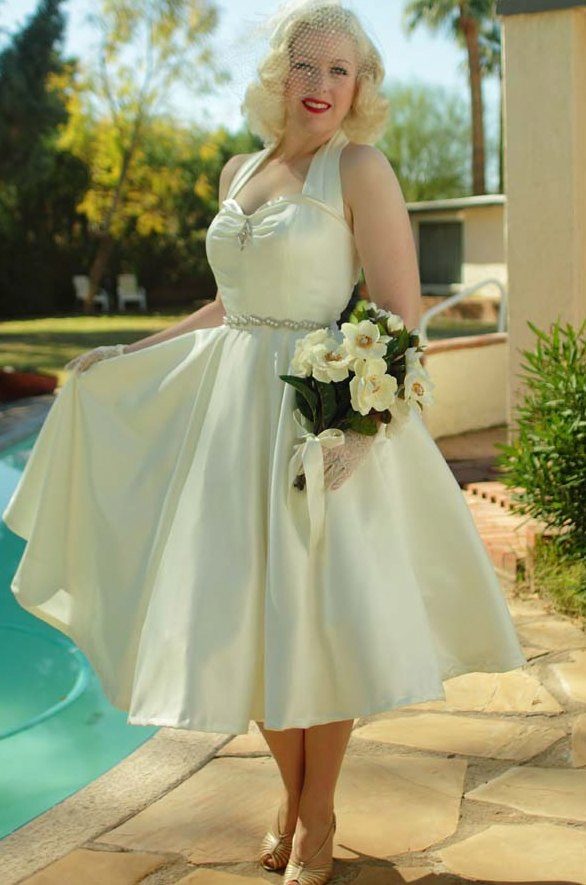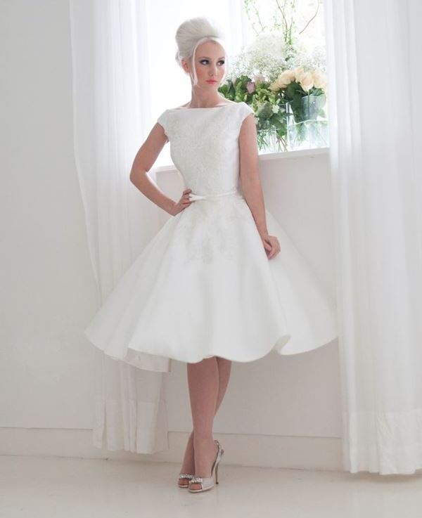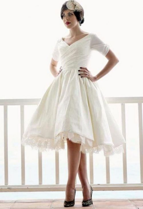 In a fashionable dress of the 50s with a corset and a full skirt, the bride will look like a real princess. This outfit allows you to demonstrate beautiful legs and focus on the original shoes, for example, on snow-white ankle boots.