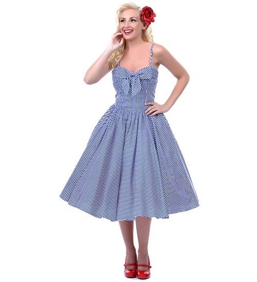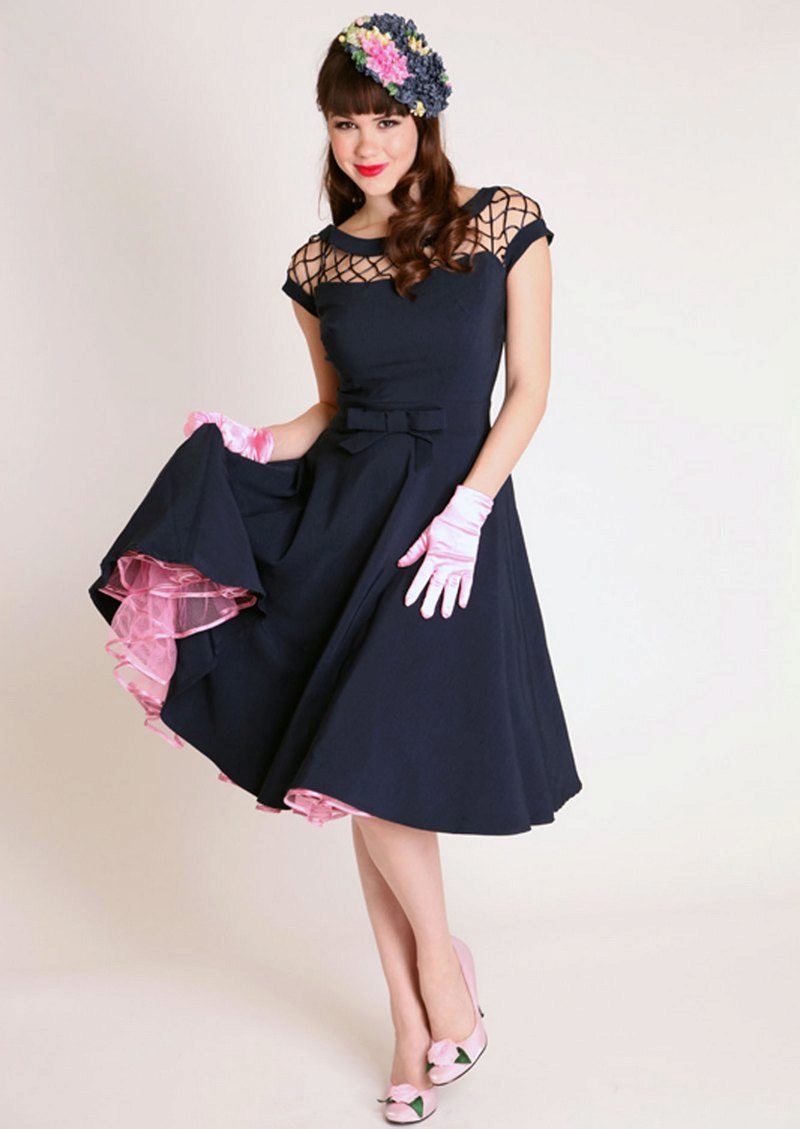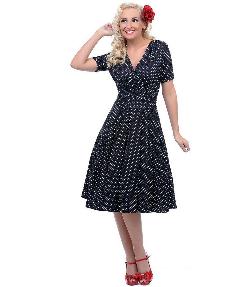 Dresses in the style of the 50s are very popular as cocktail dresses. They sit perfectly on the figure, with an emphasis on neckline and waist. The most common outfits are in blue, black, white and red.No less popular are cocktail dresses in the style of the fifties with polka dots, stripes, flowers, or a cage.