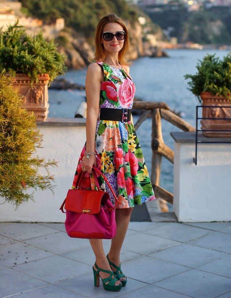 - The colors of these dresses were very diverse. Special popularity is noted at a strip, a flower print and peas. Such color combinations as black with white, pink with gray, red with brown were very common.