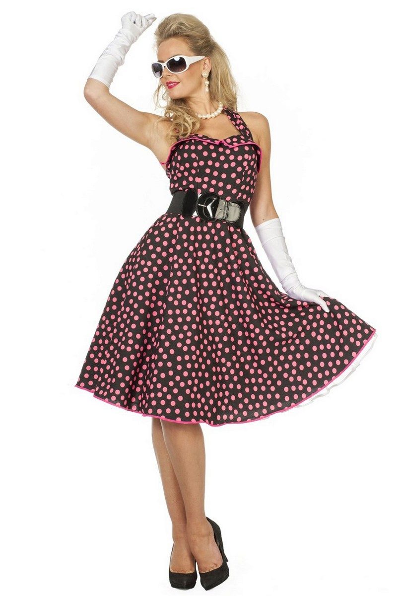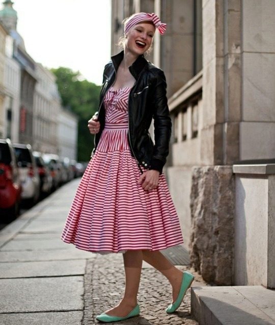 - Dress in the style of the 50s with a fluffy skirt can be worn with a leather jacket.