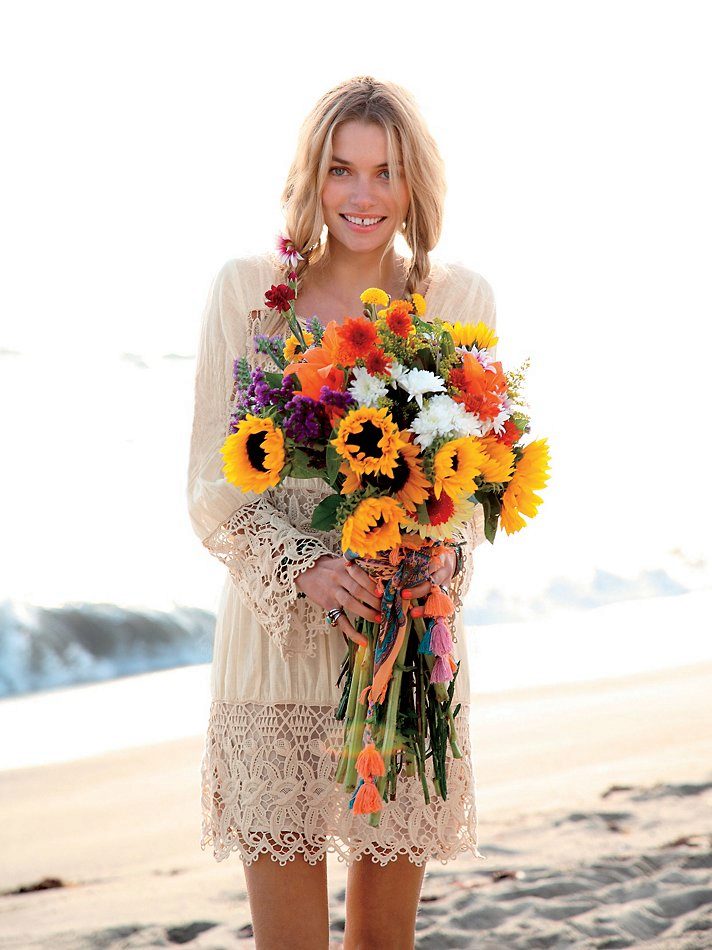 The decor should be bright - without this boho-chic can not exist. Dresses can be decorated with flounces, framed with ribbons and complemented with ruffles. Fringe can also be considered as a decor. But the flowers, prints from folk art and embroidery must be present.
