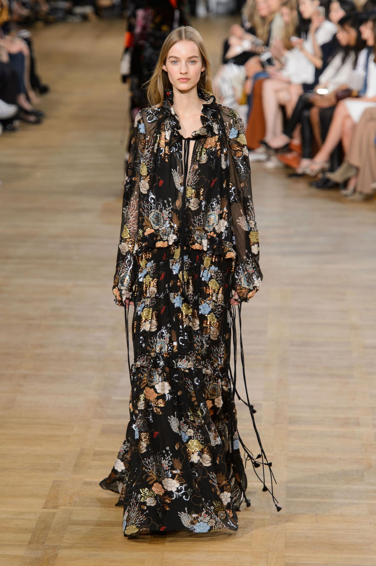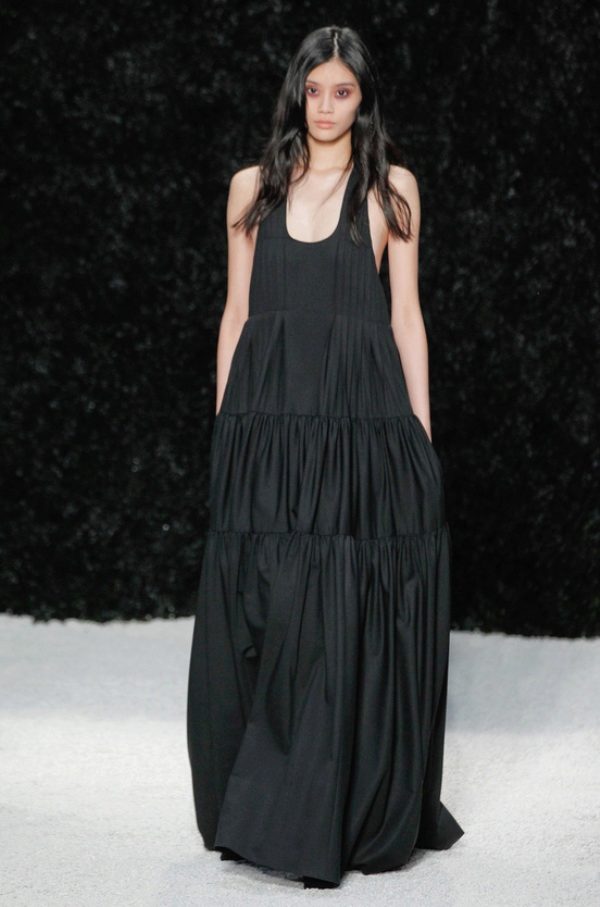 - Dresses for the most part are characterized by volumetric silhouettes, which are formed by the layering of materials, and flared lines.