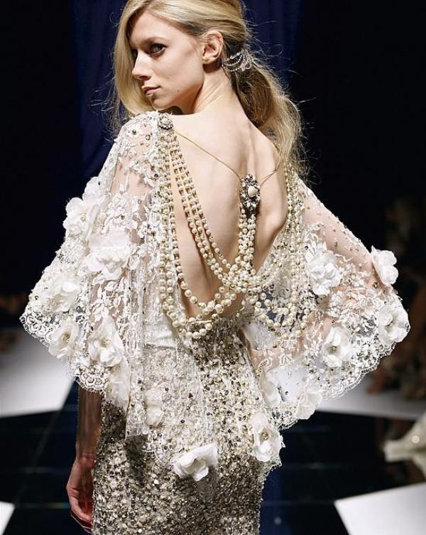 Stones, especially precious, and beads can often be found on wedding dresses or elegant models. From this decor loom ethnic patterns and fancy curls.