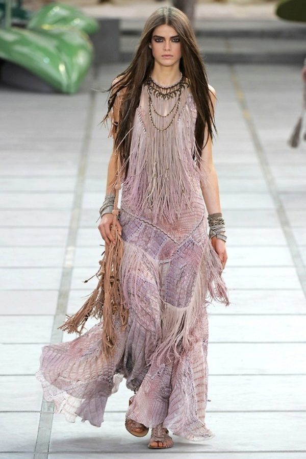 Boho style incorporates many other areas, including the village. Here it will be appropriate to fringe, which often frames the hem of a dress or highlights only some fragments of the dress (pockets, sleeves, line).