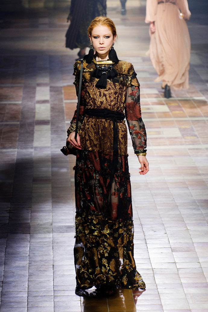 More often than usual, the decollete or the entire upper part of the dress is decorated in a similar way.