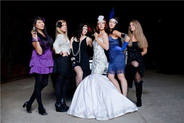 For a Chicago-themed wedding, there should be a matching dress with a slim silhouette and a deep neckline. Low waist, flounces and flowing materials are also welcome. But the classic outfit here is not entirely out of place.