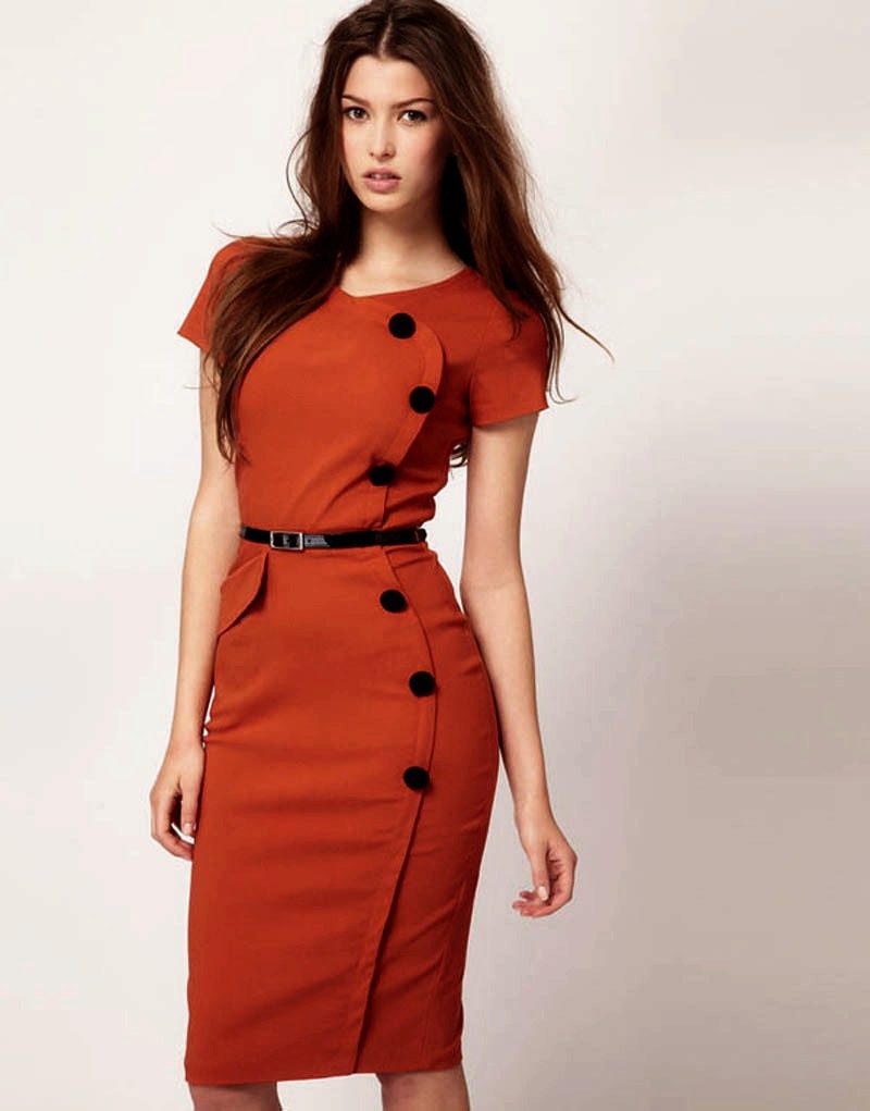 Sheath dress is a business dress code for almost a century. Stylish, discreet dress looks great on every woman. The classic version of this model has no sleeves and has a round neck. Direct cut does not always look beautiful on a girl, so many designers offer their models of business dresses. Office dress can be narrow and flared from the top, with a smell or straight cut, decorated with small tucks at the bottom.Each model should look strictly and stylishly, and also have a moderate length and a closed chest area.