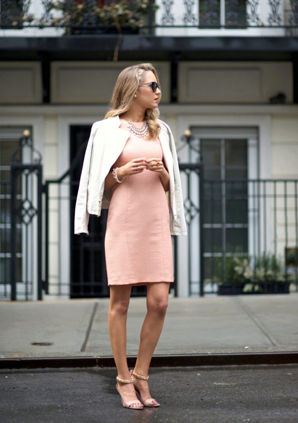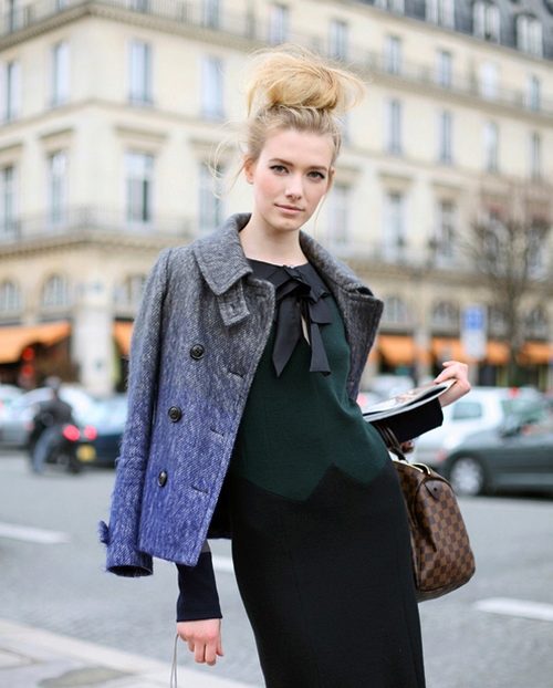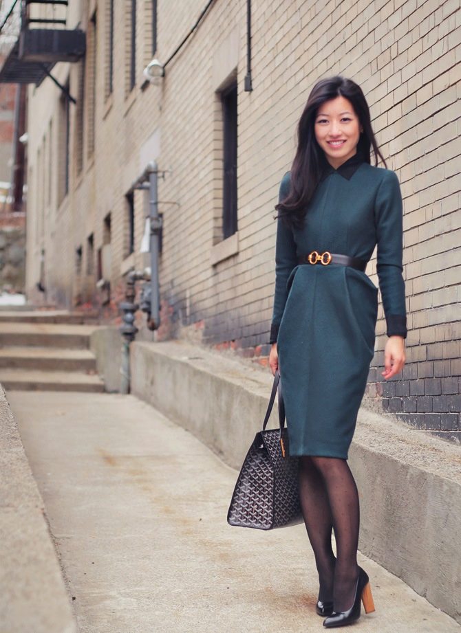 On top of the dress, you can wear a fitted jacket, cardigan or a coat with a neckline, which should be in harmony with the neck of the dress. When choosing shoes worth paying attention to neutral shades. An excellent option would be high boats. Business style should be in every detail. For example, a small bag on solid handles will emphasize the elegance of your image.