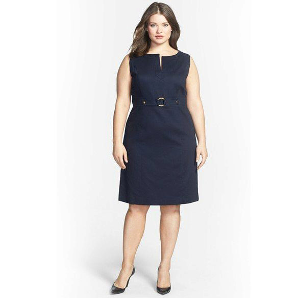 Business dresses for this type of figure should go over the body and emphasize the waist. You can stop your choice on a sheath dress or a tapered version with a slightly flared skirt.
