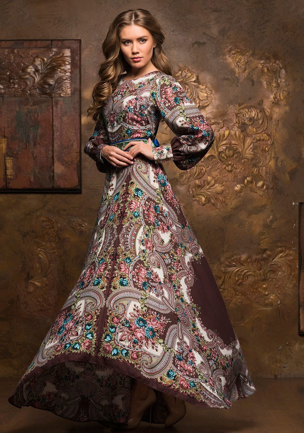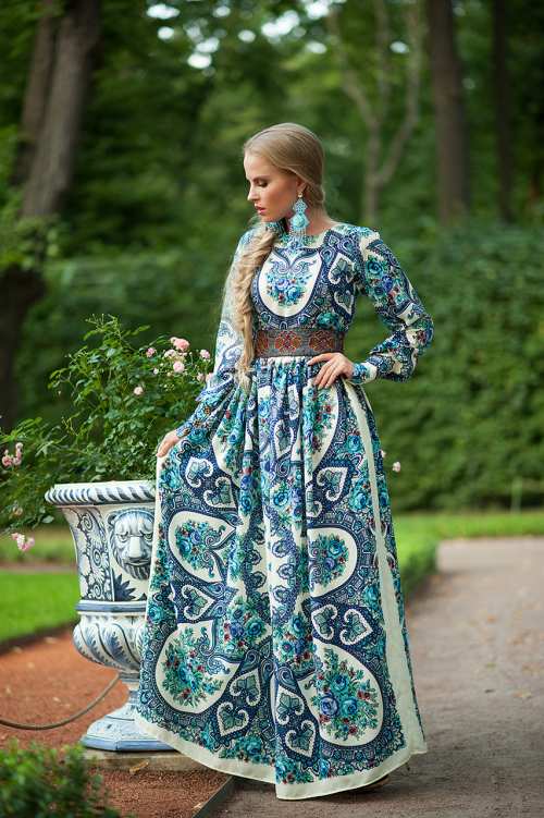 The modern Russian-style clothing combines modern fabrics, national motifs, handmade.Compared to the traditional lush long sundress, the dresses in Russian style, which are in demand today, are thinner, the length can be different, there are no petticoats, the use of corsets is possible.