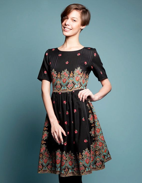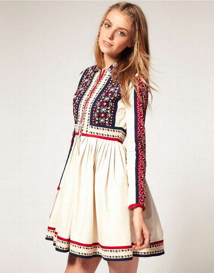 Staple dress in national motives is created from fabrics with small or large ornaments. In this outfit can be a neat collar, and a small neckline. The sleeves of such staple dresses may either be absent or have different lengths. The styles of such dresses are very diverse and are easily chosen for any shape.