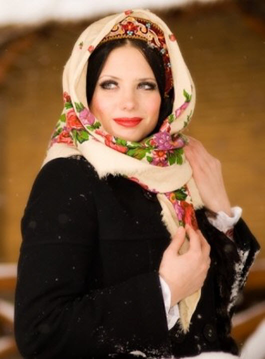 - Quite often, a scarf is acquired for a Russian-style dress. Depending on the style and style of dress, such a scarf can be wool, lace or with an ornament.