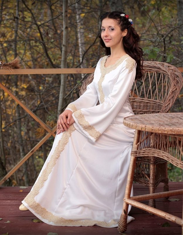 If you want a Russian-style wedding dress, you can choose a snow-white dress with traditional ornaments, a long veil, a kokoshnik or a floral wreath, large beads. Complement the outfit, depending on the time of the year, with a wrap or a vest with a fur edge.