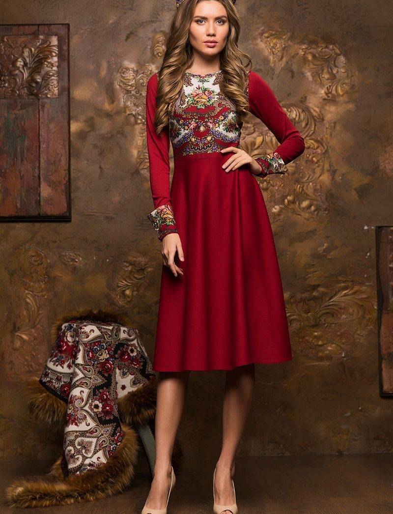Feminine dresses of medium length in Russian style can be either fitted, or with a flared skirt, with or without a collar, with sleeves of different lengths. The main highlight of these outfits is the traditional ornament, the use of embroidery or lace in the decoration.
