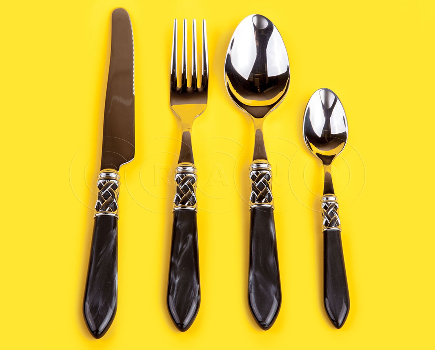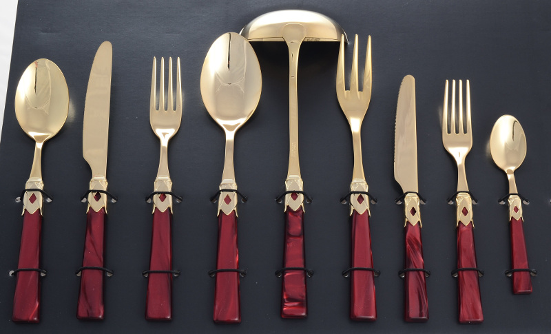 This company is famous for its unusual color solutions in the production of cutlery. The line includes spoons, knives and forks with spectacular red, purple, orange, blue and pink handles. These can be options with a gold-plated or silver-plated ring, artificially aged products, handles with specks or stripes, specimens with transparent handles and gold splashes.