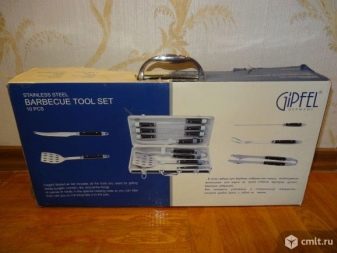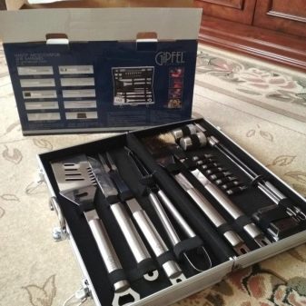 The company Gipfel recommends the classic package bundle from 3 items to large for 6 people. These are various grill grates, cleaning brushes, skewers, turning blades, perforated pans, trident fork, textile and silicone sticks and much more. The range is quite rich. Items are placed in aluminum cases for orderly storage and convenience. All material is created from environmentally friendly raw materials - carbon steel, stainless steel, silicone and wood. Each product is certified.