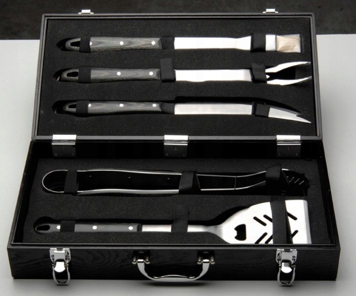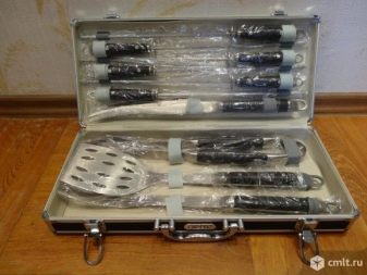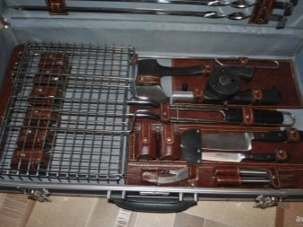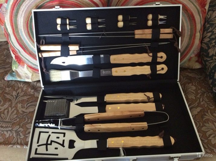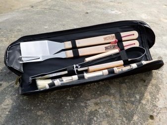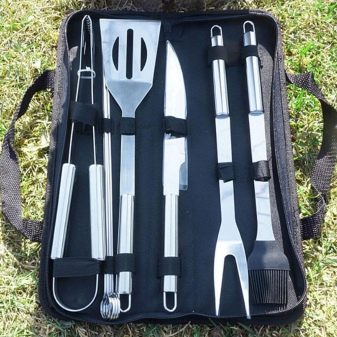- Inexpensive economical includes all the indispensable: a few skewers, grate, spatula, fork. Such sets are packed in a plastic case with a handle or in a wooden basket that looks more organic.