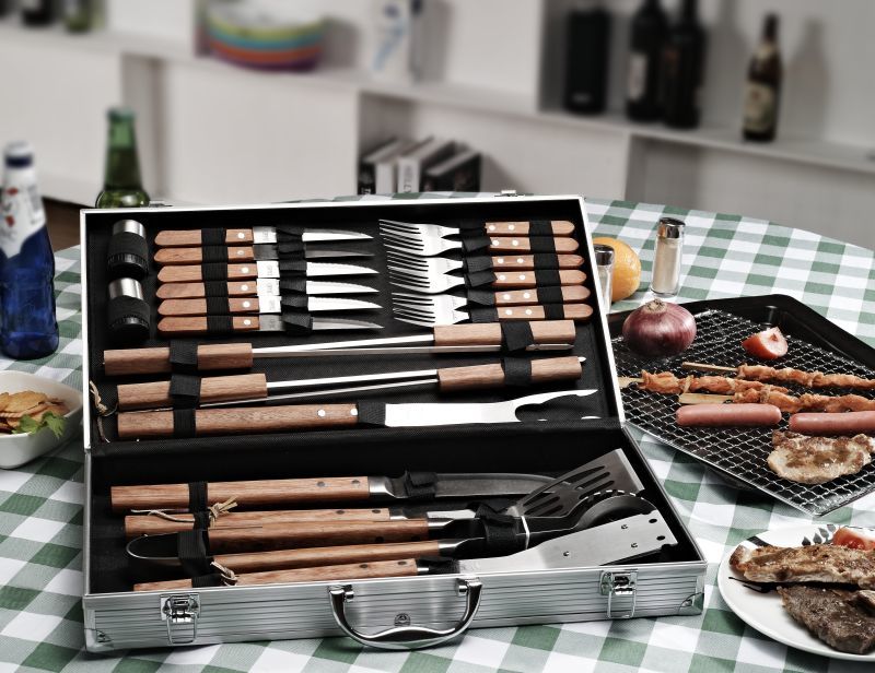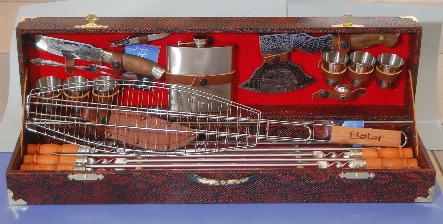 The company offers the magnificent sets created from high-strength stainless steel, differing by unusual appearance and a practicality. Each set is equipped in an aluminum suitcase with handles, which has everything for a successful picnic: skewers, paddles, forks, salt shakers, and more. It is light and looks impressive, apparently it does not even look like a picnic set, but looks like a business case. Cutting, frying, grabbing, shooting with such tools is unusually convenient and simple.