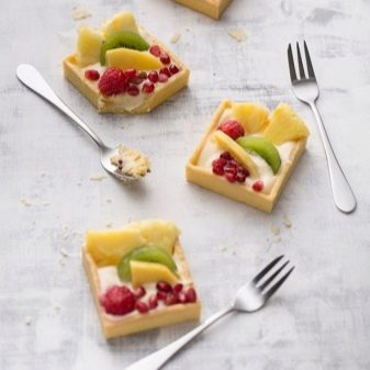 Fruit appliances are smaller in size than those intended for dessert. The fruit fork has not 3, but 2 cloves. Her pen is the same as the knife. A coffee spoon is used not only for making coffee, but also when working with tea, fruit cocktails, even with grapefruits and soft-boiled eggs.