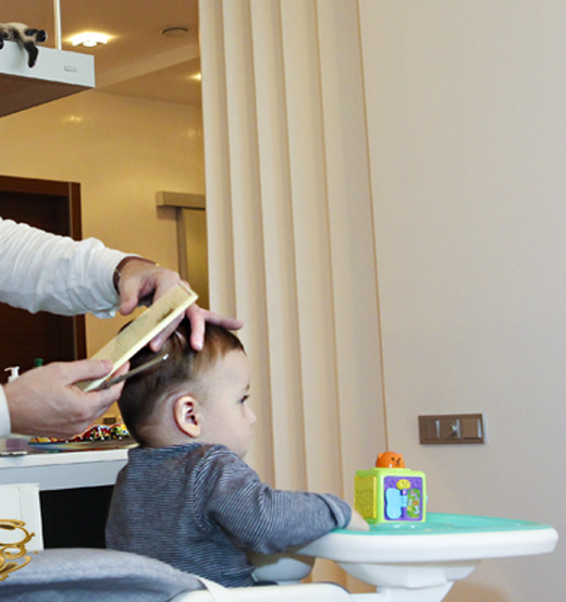 - Seat the child on a chair and cover it with a cape from the shoulders, securing its upper edge around the neck.