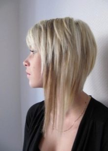 - Asymmetrical bob-caret with lengthening. This haircut is in great demand. This hairstyle always looks spectacular, so it is suitable for women who are not afraid of a large number of enthusiastic views in their direction. Haircut emphasizes the cheekbones and adds expressiveness to the eyes. The main thing is to choose the best option for parting. It is made taking into account the features of the features. Asymmetrical haircut is very lady with pronounced massive cheekbones and brow ridges, with a large distance between the eyes. With the help of properly selected asymmetry, you can hide almost any flaws in appearance.