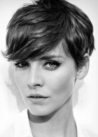The pixie hairstyle looks great on elegant women with a thin neck and expressive features on an oval classic face. It helps to harmonize a round face or smooth out the sharp features of a diamond-shaped, square, triangular face. A short haircut helps to open your face perfectly and to emphasize large features: eyes, lips. Asymmetric or torn fringe gives the image lightness and carelessness.