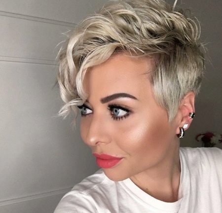 It would seem that a short haircut does not allow to play with variations of styles and images. But medium-length pixies with oblique bangs are the best choice for experimenting with style and image. Today is a fatal beauty with hair combed back, tomorrow a romantic person with twisted tips and a flirty rim in rhinestones. A few days later a young woman, stylish and confident with lively, slightly disheveled hair.