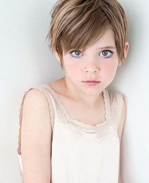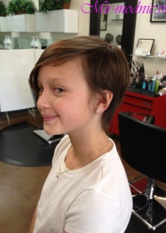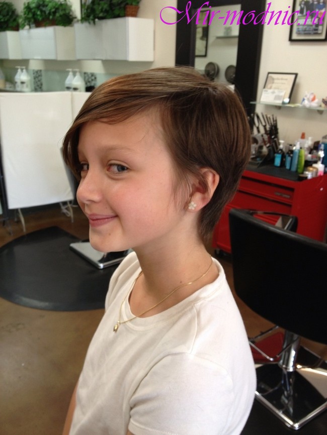 At the age of 9, the little girl will obviously like the pixie hairstyle with shortened strands. Especially good, it will look on slim schoolgirls of small stature. For curly thick-haired girls, an elongated bob with a neat bang is more suitable. Other hairstyles that are suitable for this age include simple bob and sleek bob with bangs. The age period from 11 years and up to 17 years is characterized by the ability to repeat any adult hairstyles, especially if the girl looks mature. As an option, it can be a short cheeky haircut in the style of punk, extreme Mohawk and others.