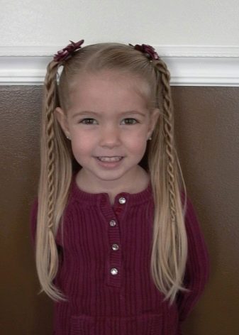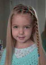 - Long hair decorated in a beautiful hairstyle. The combination of tails and weaving looks harmonious, and annoying strands do not interfere with the child.