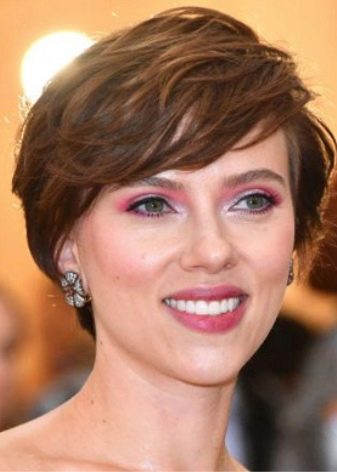 - Incendiary Scarlett Johansson skillfully chose different images and always looked amazing: spiral curls on the shoulders, short classic haircut based on curry, outrageous pixie, hairstyle with a scythe in a circle.