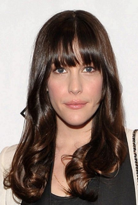 - Liv Tyler looks amazing with thick straight bangs. The hair is shiny and well-groomed, twisted into soft rings at the ends.