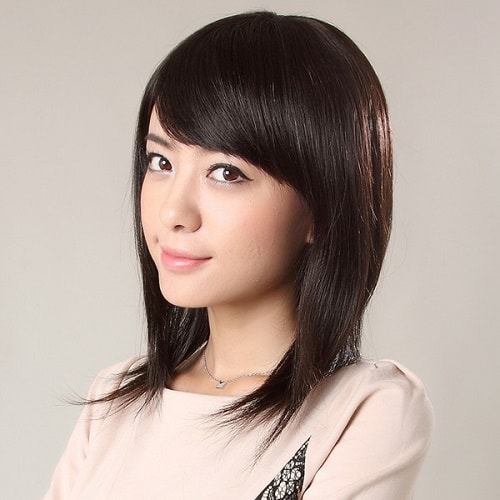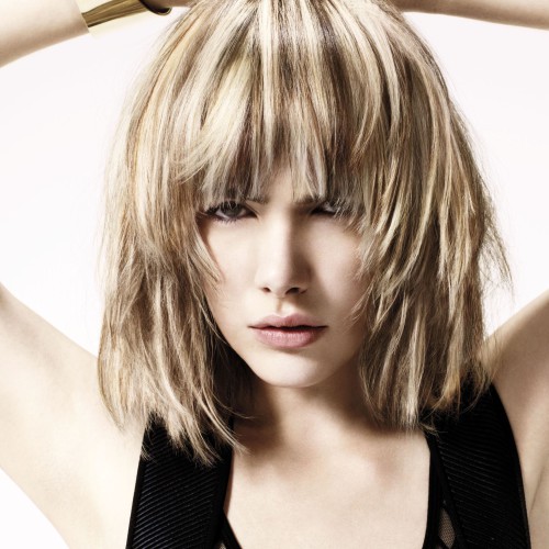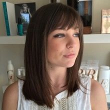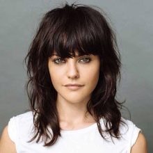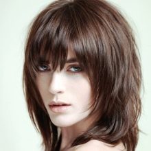 - Sometimes haircuts are also considered separately. to shoulders with bangs, although in most cases they are a variation of one of the hairstyles described above, and in the circle of stylists may have a completely different, particular name. A relatively short hair does not mean that the face should be completely open - the girl herself decides how long the fringe should be and how much it covers the forehead and cheekbones. Acceptable options are both oblique, and straight, and milled bangs - it all depends on your preferences.