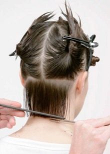 - comb the lower control strand, if necessary, moisten it with a spray bottle, grab a part of the strand in the middle with two fingers, pull it down and cut the damaged tips (it is important to keep the strand parallel to the back without lifting it up), then trim the tips of the strands on the right and left, grabbing them with part of the already cut strands and controlling the length of each slice along it;