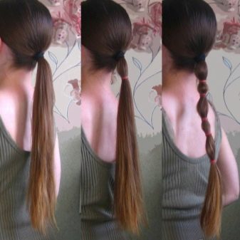 Then we fix with the help of additional elastic hairs in the tail, placing them every 3-4 cm along the entire length. The lowest retainer should be located just above the intended level of the slice. Fixing a thin tip of the tail between the fingers, and keeping the scissors parallel to the fingers, carefully cut off the hair. At this stage, the hair cut has a not very straight line, the strands in the central part are slightly shorter than the side regions.